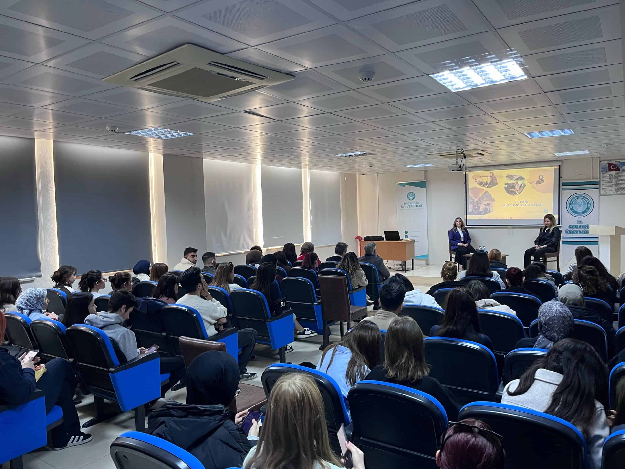 ‘Havacılıkta Kadın Olmak’ ve ‘Havacılık Sektöründe Kadının Rolü’ başlıklarıyla düzenlenen etkinlikte, Türk Hava Yolları Pilotu Emine Elif Coşkun ile Cumhurbaşkanlığı Özel Uçak Eski Kabin Amiri Oya Hansu Çolak öğrencilerle bir araya geldi. Konuklar, mesleki deneyimlerini ve kariyerlerinde karşılaştıkları zorlukları aşma süreçlerini paylaştı.